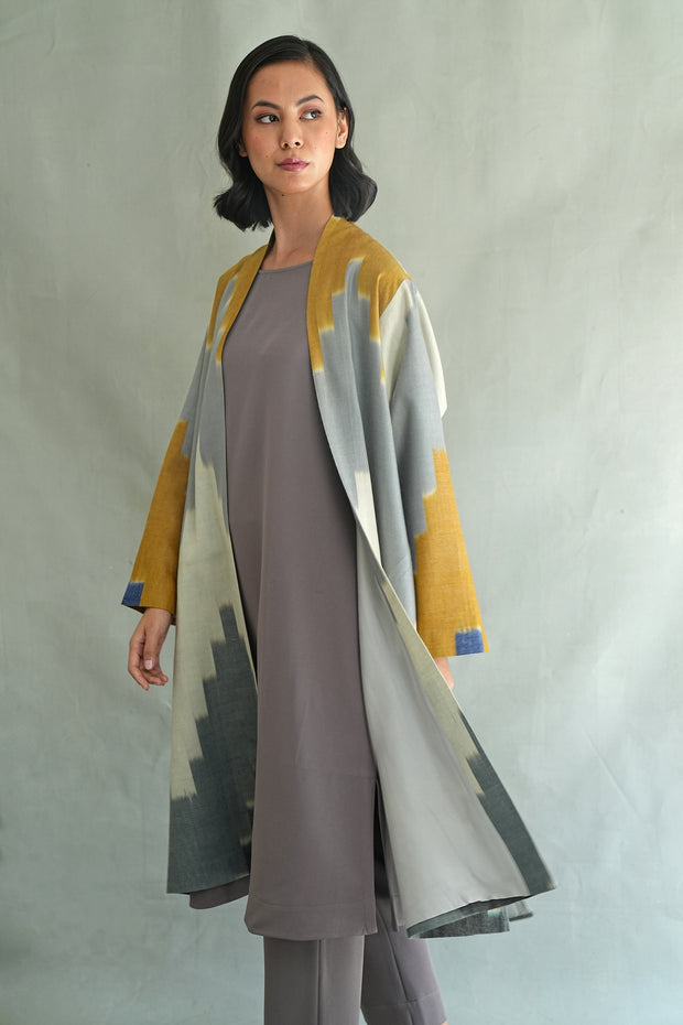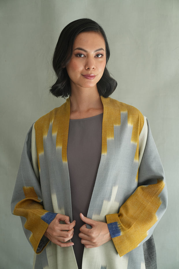 Part of our evolving overcoat series, the Ikat Pashmina coat brings together two distinct weaving traditions—the fine warmth of pashmina and the structured artistry of warp-faced ikat. Its chevron pattern lends a touch of playfulness to the design, resulting in a modern, versatile piece that seamlessly fits into contemporary wardrobes while staying rooted in craft heritage.