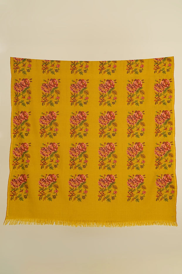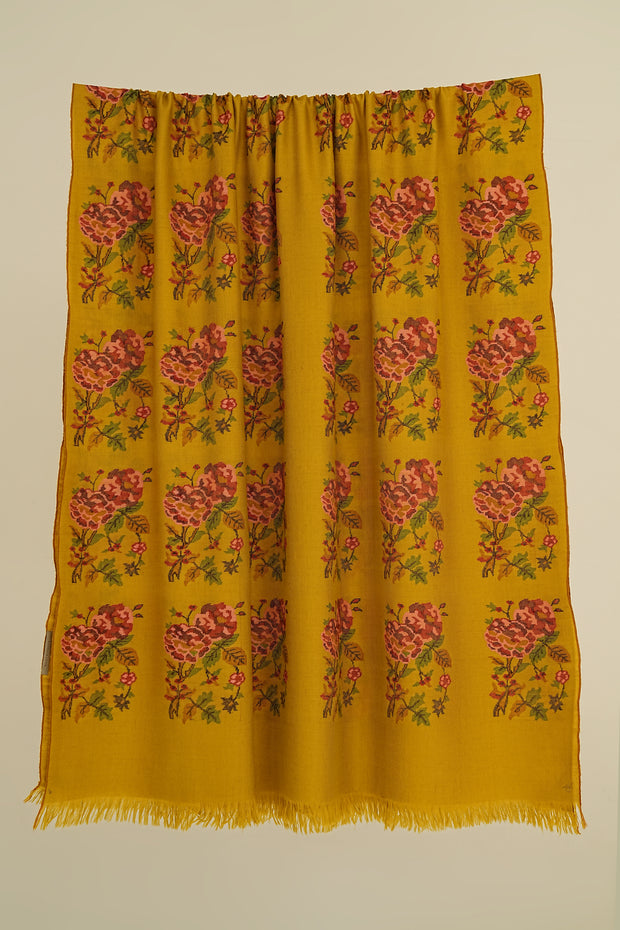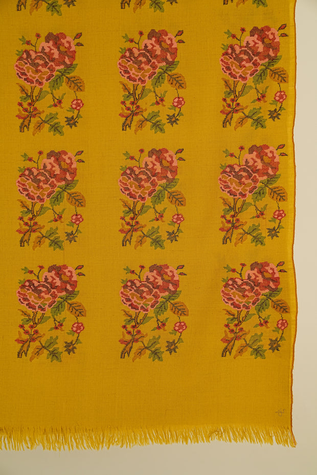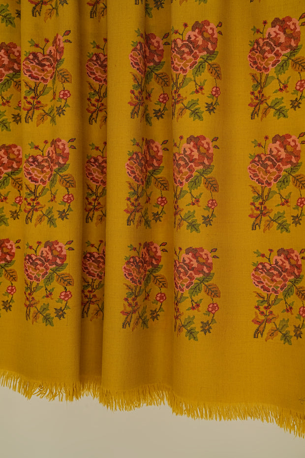 Repeating rectangular butas featuring roses and foliage are delicately embroidered across the soft pashmina base. The design blends traditional floral motifs with a contemporary sensibility, creating a piece that feels both classic and modern.