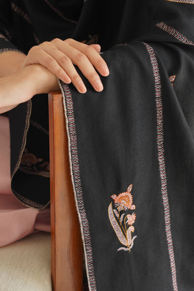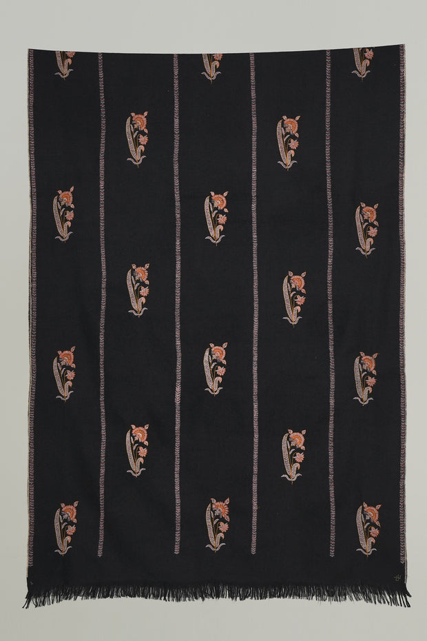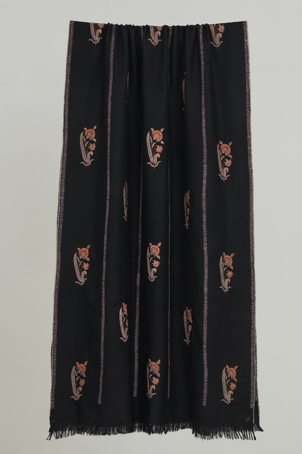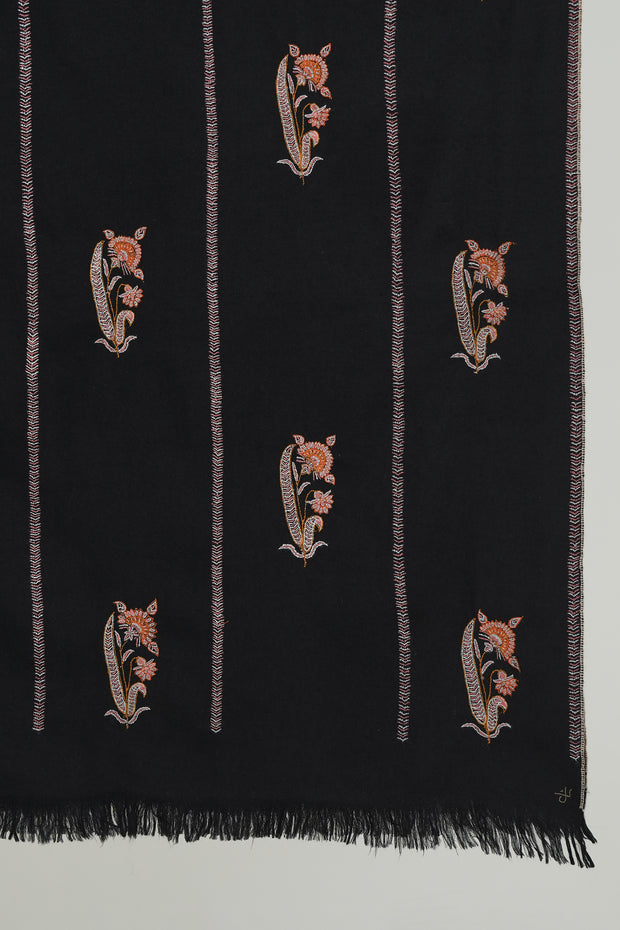 Swaying blooms embroidered in pink and pastel hues, gracefully arranged across the stole and interspersed with delicate vertical lines, stand out beautifully against the melancholic black base. A perfect blend of softness and depth, this piece exudes timeless elegance and poetic charm.
