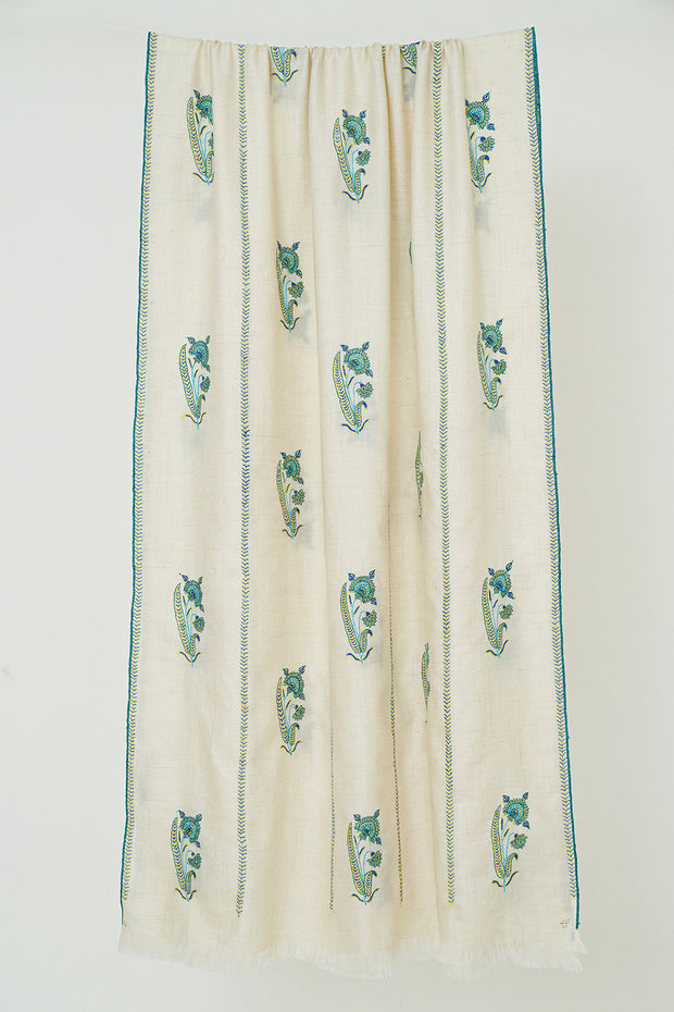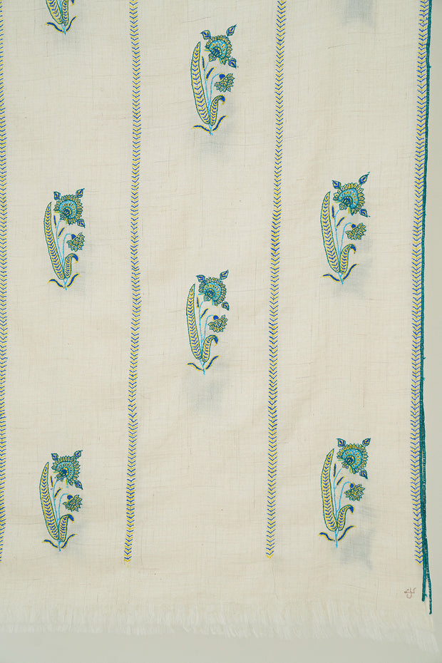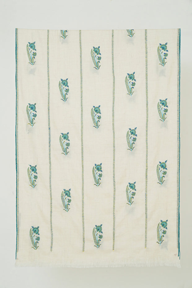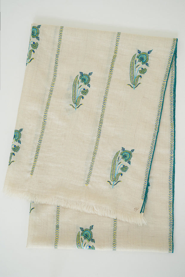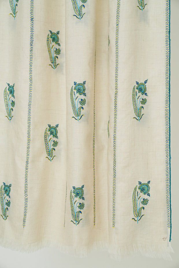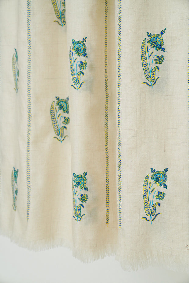 The Ziah stole presents a contemporary interpretation of the intricate vintage Khatrast design. Floral sprigs, inspired by an 18th-century block print textile fragment, are meticulously arranged in straight lines. These are interspersed with a delicate chevron border, thoughtfully chosen to complement the filling in the leaves. This cashmere stole embodies a perfect blend of modern style and historical inspiration, making it a unique addition to your wardrobe.