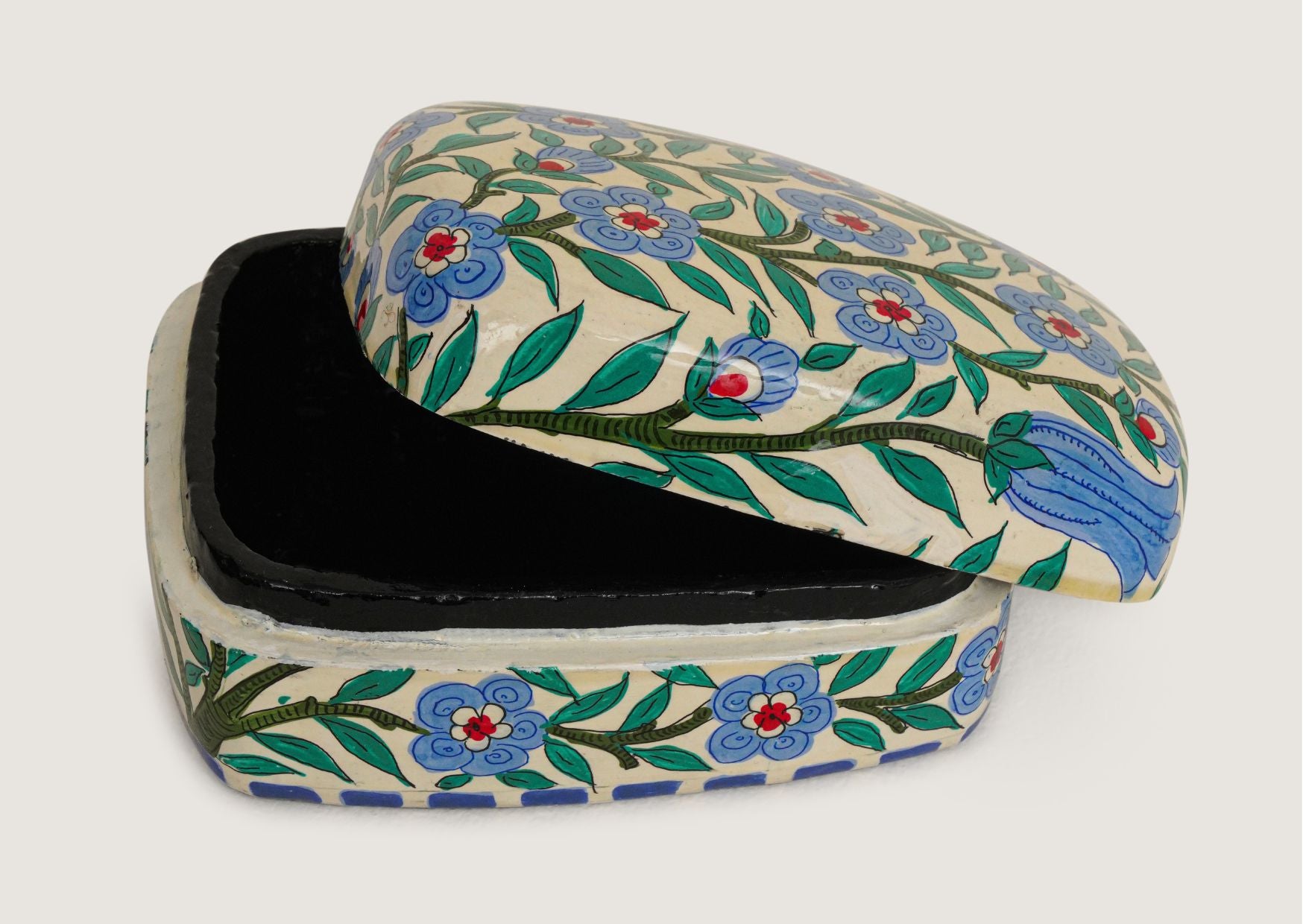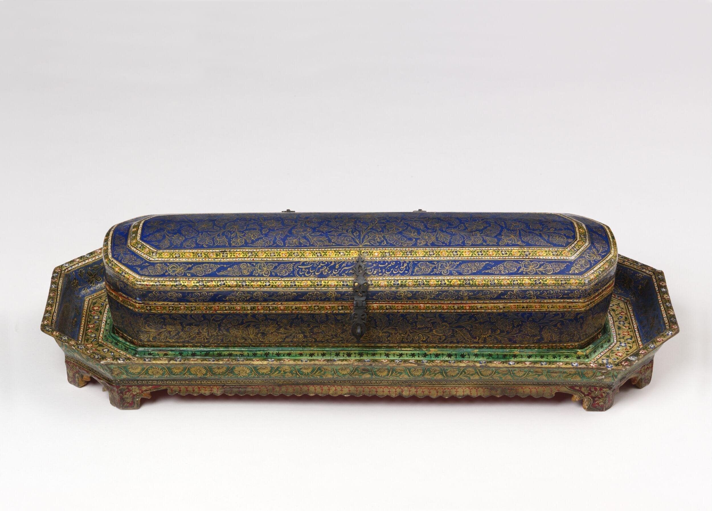 Papier-mâché itself had reached Kashmir centuries earlier, introduced in the 15th century. Known locally as Kari Qalamdani (literally “pencase craft”), it was originally reserved for making pen stands before expanding to a wide range of objects, from decorative ornaments to finely worked furniture.