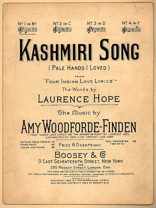 The poem was titled 'Pale Hands I Loved Beside the Shalimar' and was popularly known as 'Kashmiri Song', a 1902 song by Amy Woodforde-Finden based on Hope's poem.
