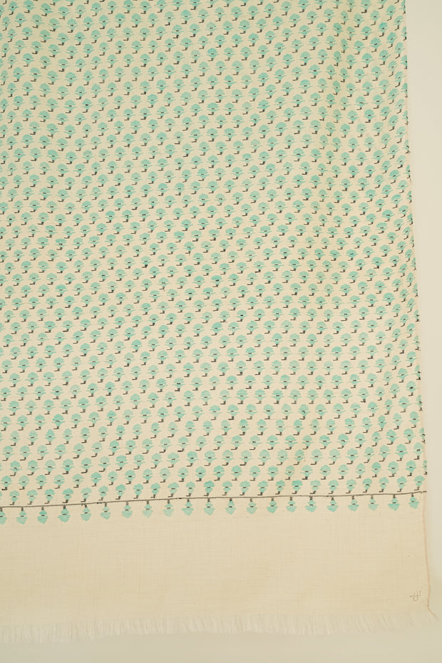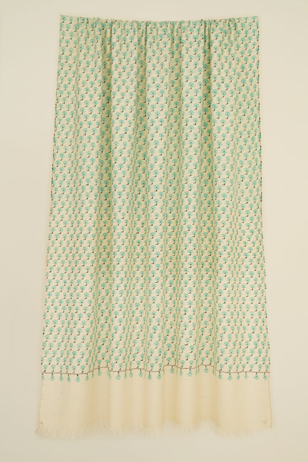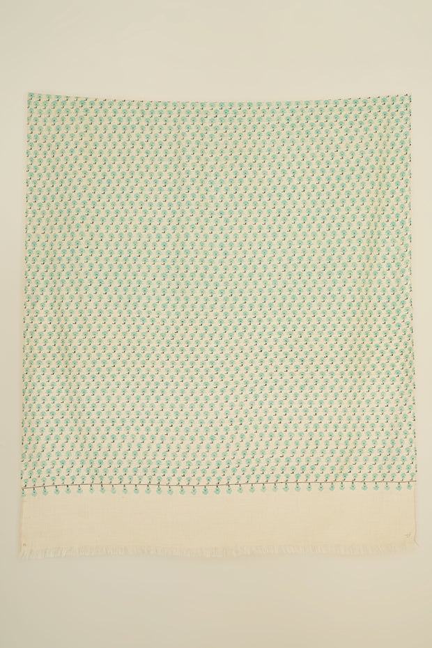 The field of this shawl is filled with very minuscule butis arranged in a closely spaced repeat across the surface. Their compact placement creates a finely textured ground that gives the design a quiet yet detailed presence.