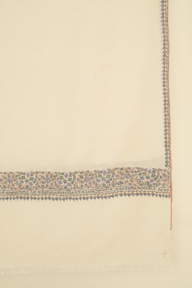 The palla of this shawl is defined by a wide dordar border composed of flowing floral vines that create a strong visual frame. The dense arrangement lends weight and richness to the terminal panel while maintaining a sense of movement within the design.