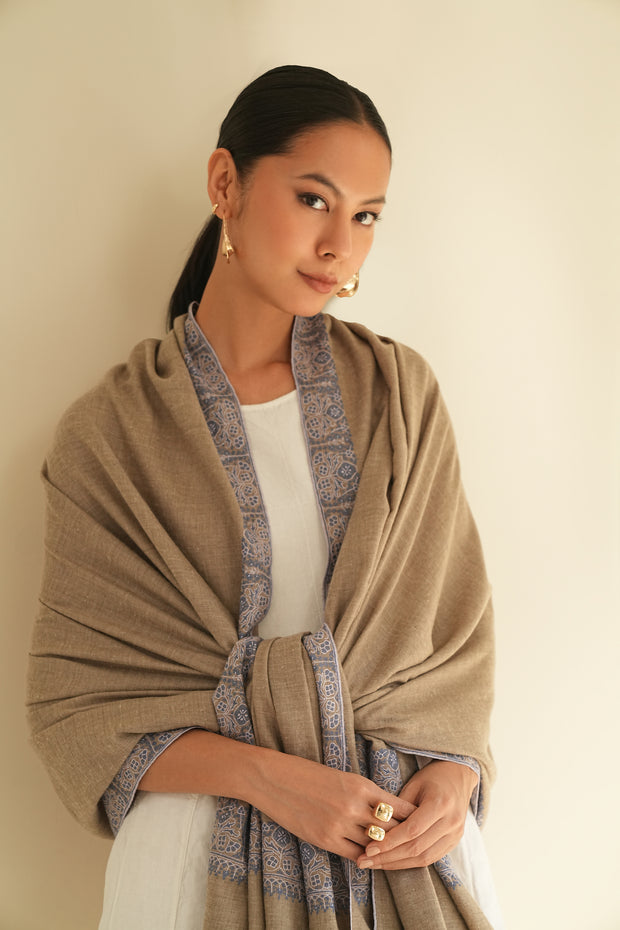 A repeat motif worked in dense embroidery forms a strong dordar band along the border of this shawl. The structured repetition gives the edge a clear rhythm, while the closeness of the stitching highlights the precision of the craftsmanship. Set against a natural grey ground, the blue embroidery stands out with quiet clarity, creating a refined interplay of tone and texture. The palette balances heritage design with a colour sensibility that sits comfortably within contemporary wardrobes.
