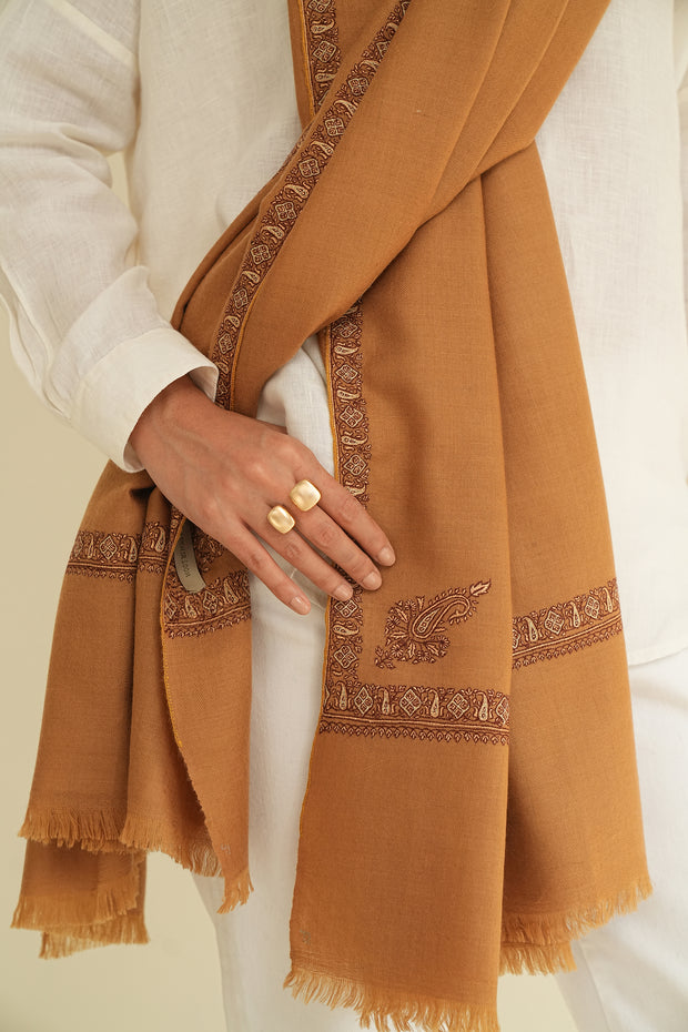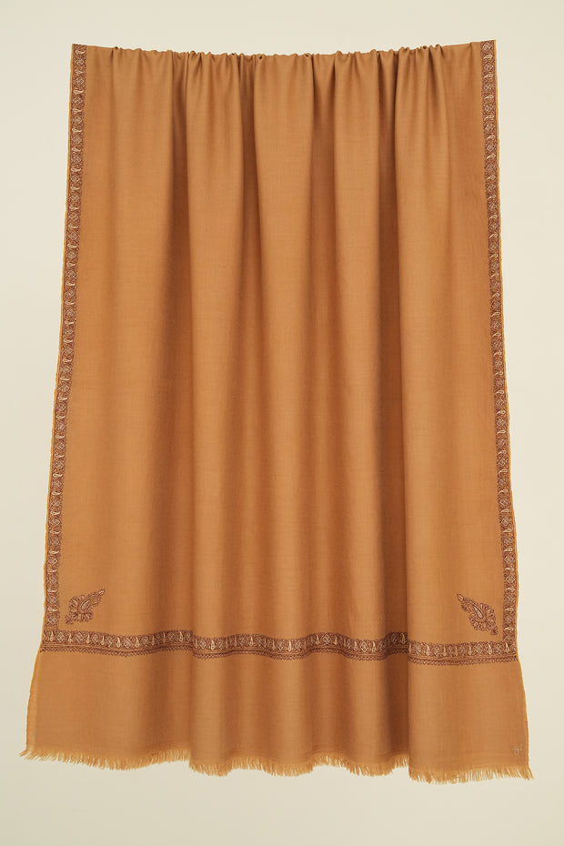 Set on a soft ground, this shawl features dark embroidery that brings clarity and depth to the design. Subtle accents of white thread are interspersed throughout the motifs, creating gentle highlights that enliven the surface without overwhelming it. Each corner is finished with delicately embroidered paisleys that anchor the composition with quiet elegance. With its restrained palette and refined detailing, the shawl offers a thoughtful choice for those drawn to minimalistic design with a touch of craftsmanship.
