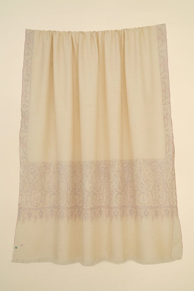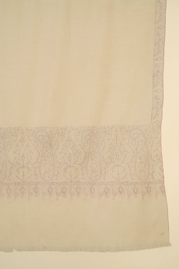 Tall paisleys interspersed with spade-shaped butas are embroidered across the palla of this exquisite shawl, creating a striking and rhythmic terminal panel. The interplay between the elongated paisleys and the compact spade forms lends the composition both movement and balance.