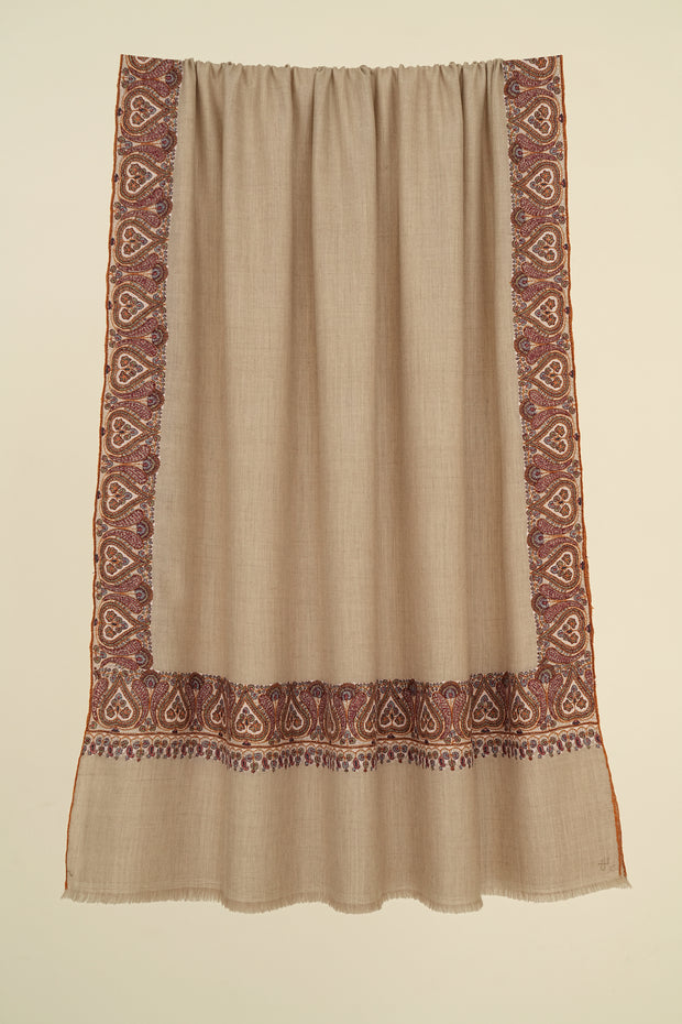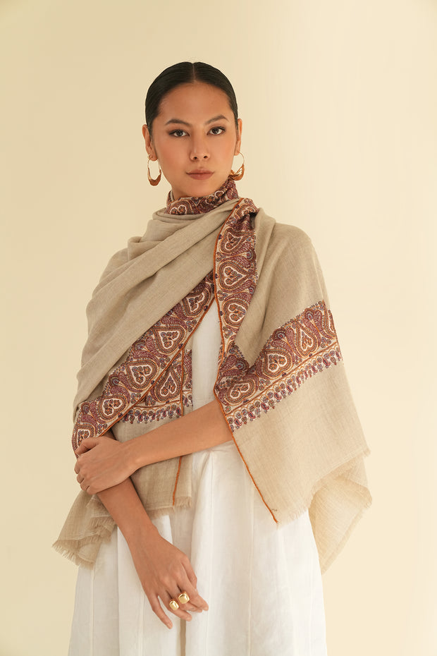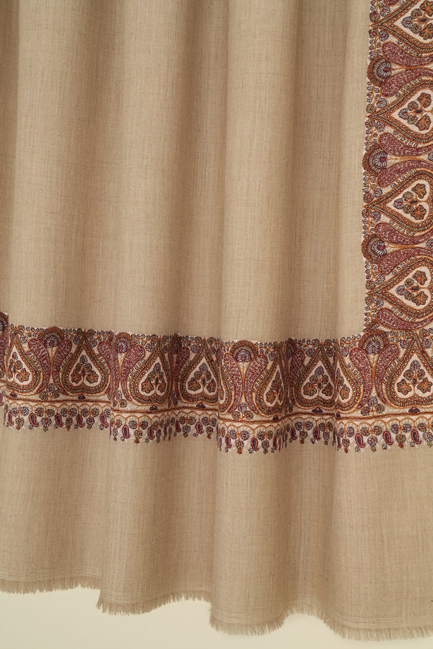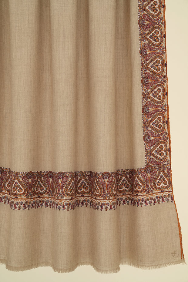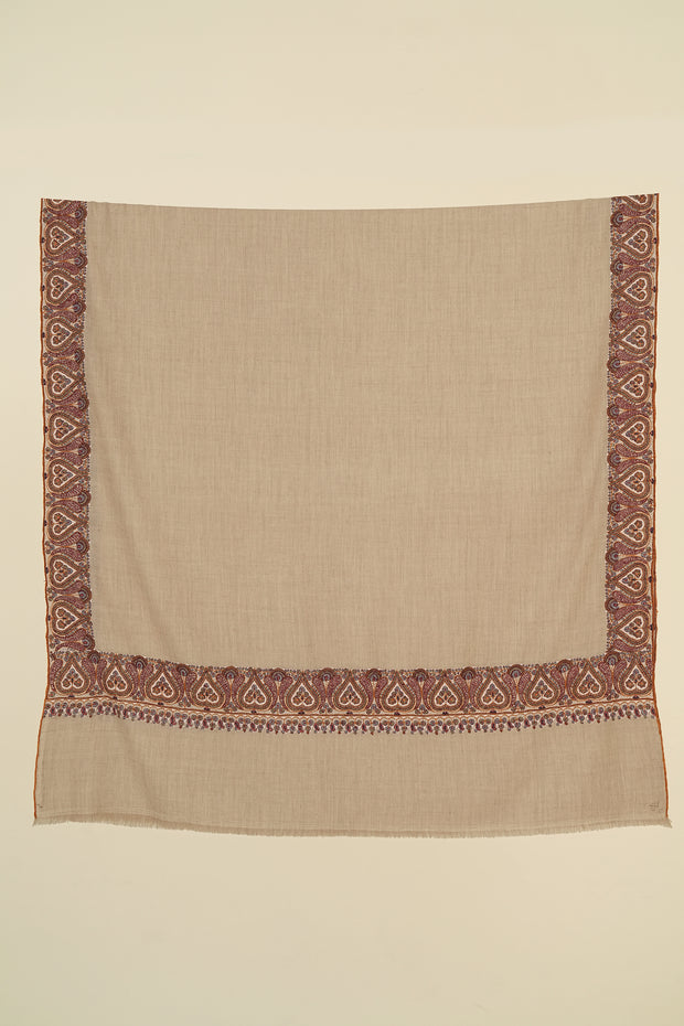 This shawl features a rich decorative dordar border defined by a repeating spade-shaped buta. Each motif is filled with intricate internal floral detailing, giving the pattern depth and ornamental richness while maintaining a strong rhythmic repeat along the edge. Executed in dense sozni embroidery, the closeness and precision of the needlework bring remarkable clarity to the design. The finely worked detailing highlights the craftsmanship behind the piece, allowing the border to stand out as the central visual feature.