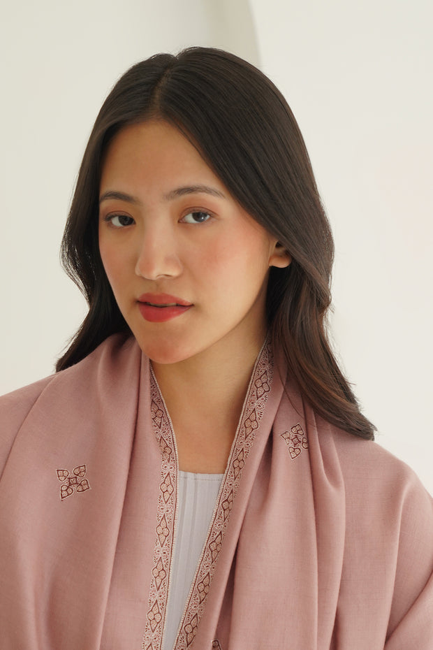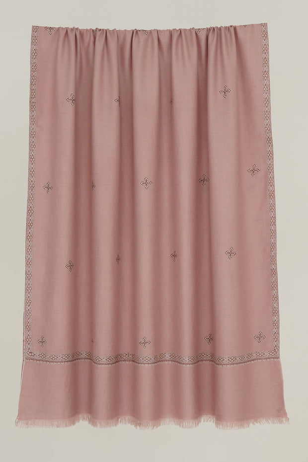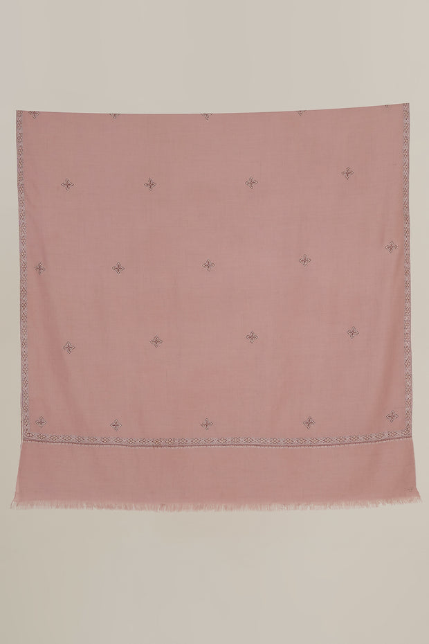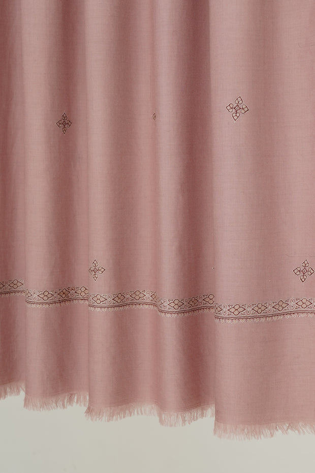 This soft pashmina shawl in a blush pink hue is adorned with delicate embroidered detailing along the borders and sparsely scattered butis, adding a touch of minimalistic elegance. A perfect choice for understated wardrobes, it offers a subtle pop of color with timeless sophistication.