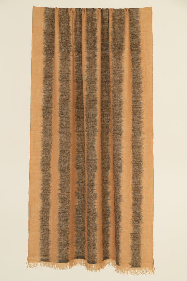 ed by classic stripes formed through ikat-dyed wefts, a resist-dye technique that introduces subtle variations and softened edges within the linear pattern. This interplay of precision and diffusion gives the design a quiet visual depth, situating the piece within a broader textile language that bridges traditional dyeing practices with a contemporary, understated aesthetic.
