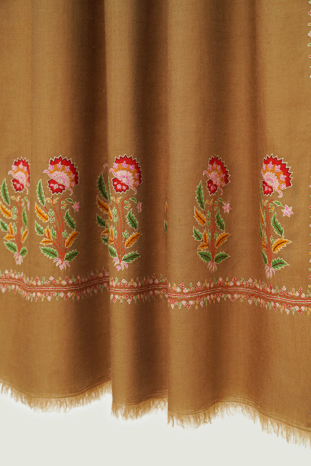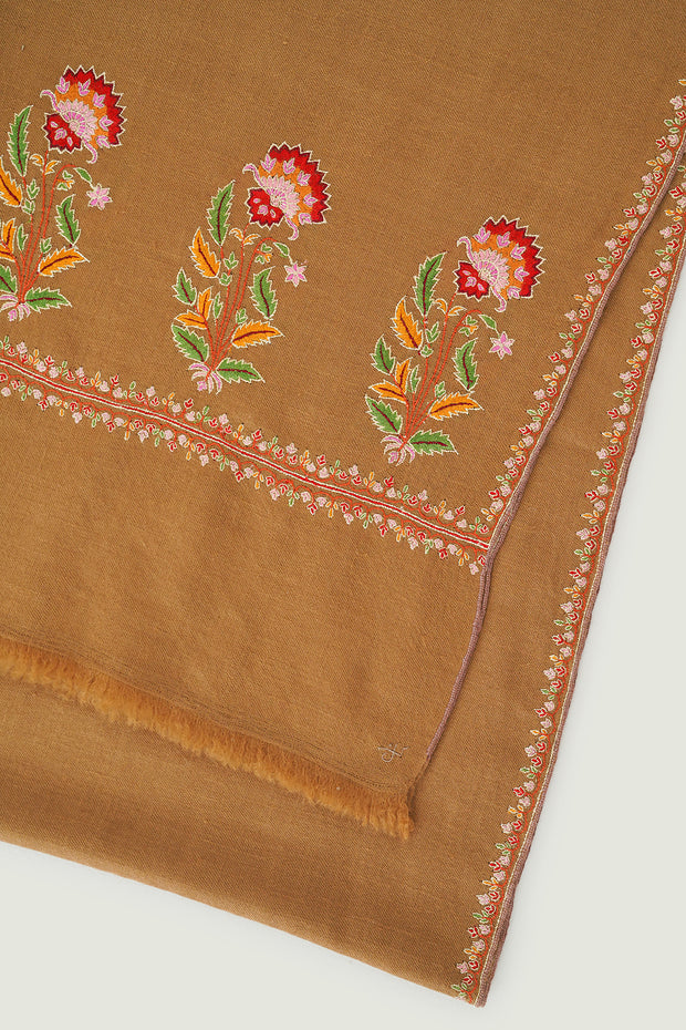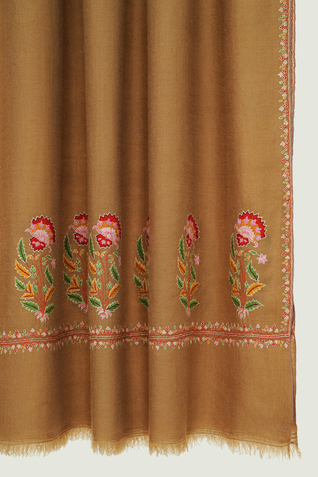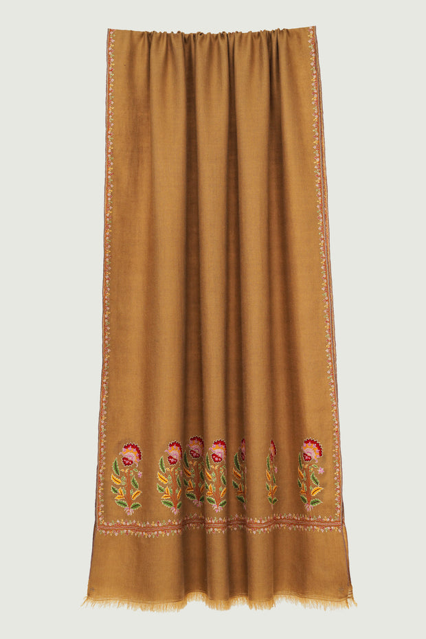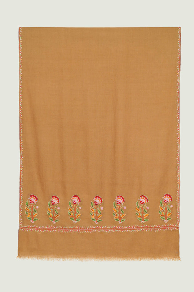 The Heera Bail Buti Pashmina stole features singular floral motifs, sprinkled across the surface. Crafted with meticulous Sozni hand embroidery, these motifs are reminiscent of the intricate brush strokes found in miniature paintings. The stole is finished with a complementary floral border along its edges.