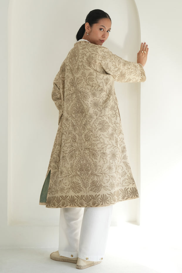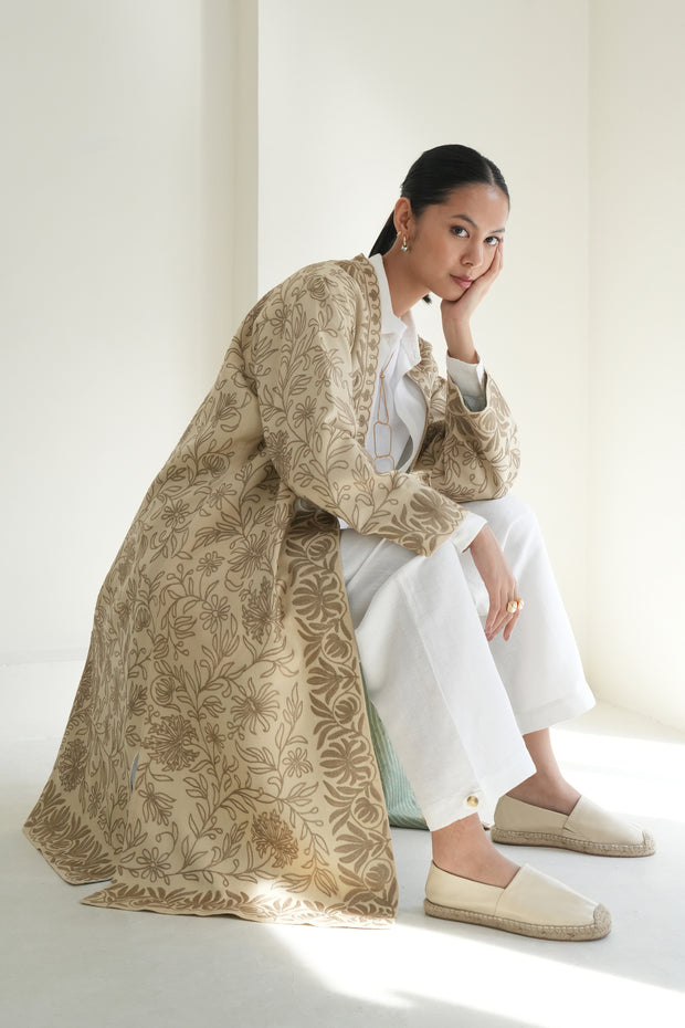 Aari embroidery is a traditional Kashmiri needlework technique known for its fine chain stitches that create detailed, flowing motifs with remarkable precision. Our wool aari choga collection marked a turning point in reviving the aari embroidery craft, once confined to shawls and threatened by the rise of machine-made imitations.