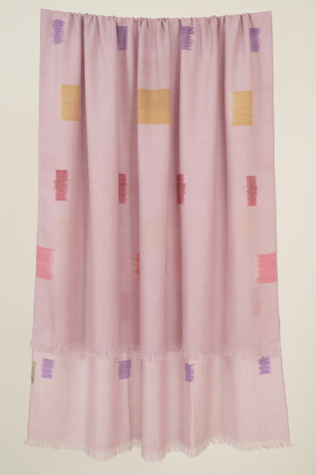 Playful squares and rectangles in equally whimsical colors are created in Ikat-dyed wefts are hand-woven on the Rubik Shawl.