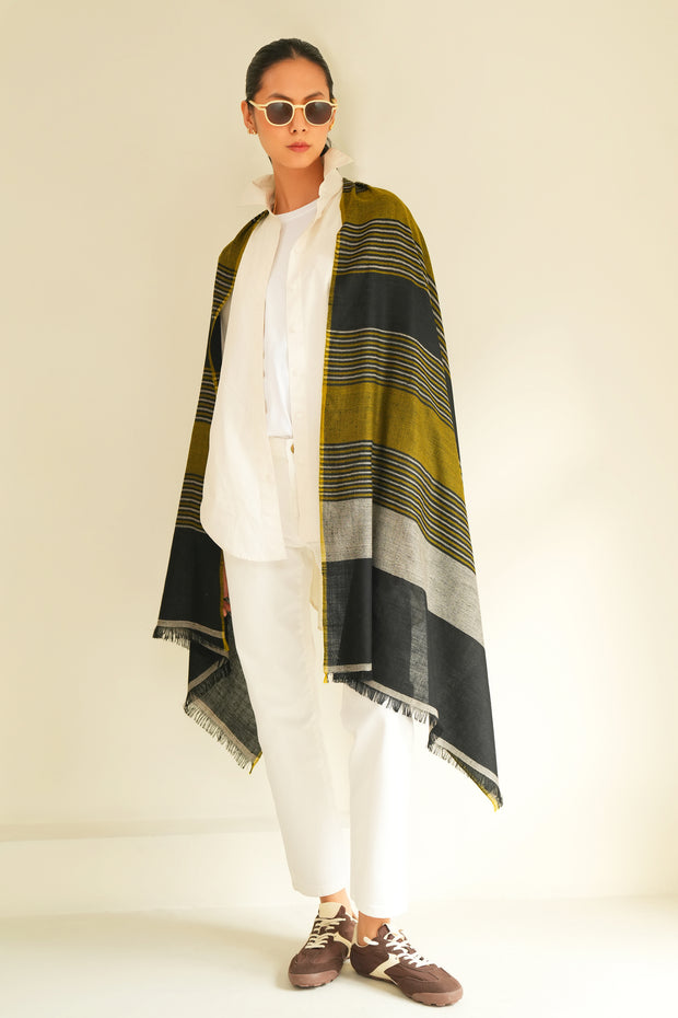 Generous in scale and fluid in drape, the shawl allows for multiple modes of wear, adapting easily across settings and seasons. Its balanced palette and minimal graphic language give it a gender-neutral quality, reflecting a contemporary approach to unisex design where versatility, ease, and understated expression remain central.