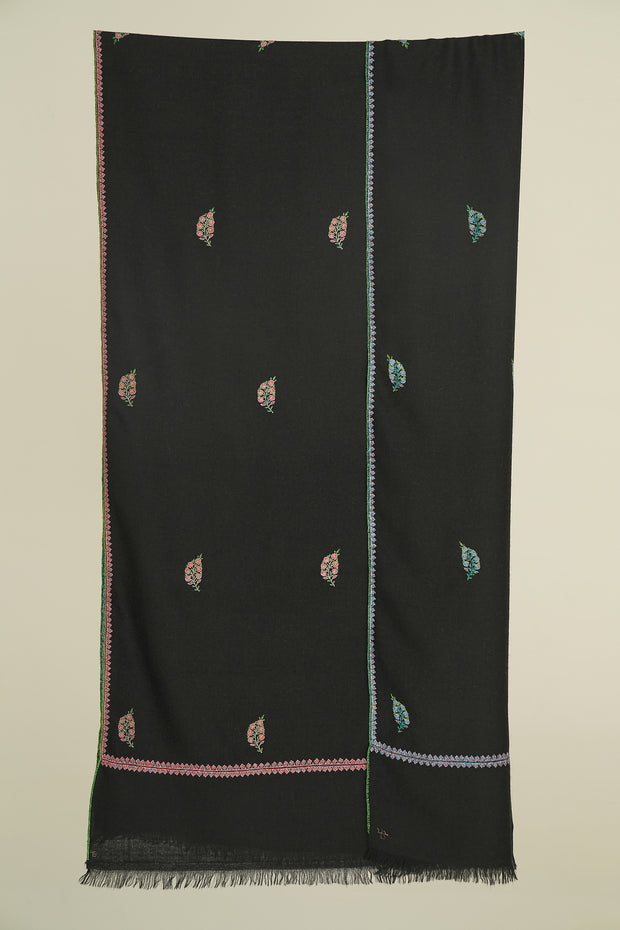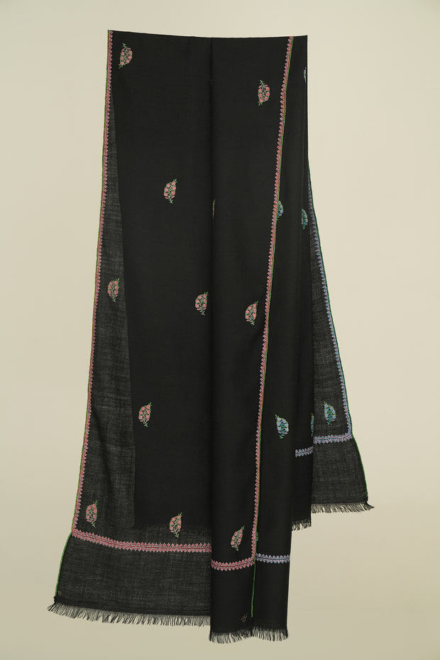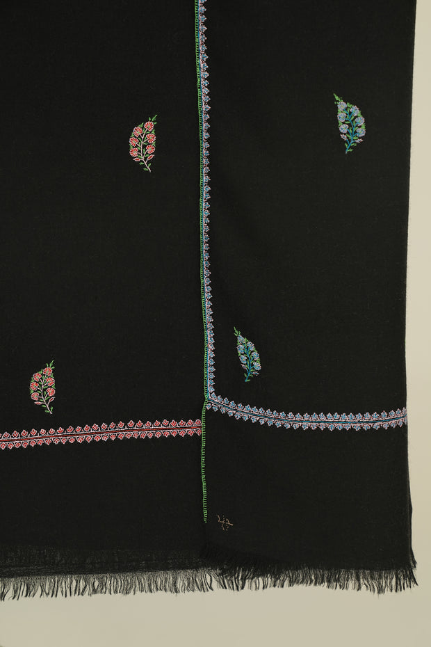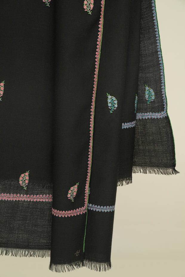 Floral butis featuring slender flower stalks illuminate the deep raven base of this stole, framed by simple hashiya borders along the edges. Elegant yet understated, it transitions effortlessly from day to evening, adding depth and character to any ensemble.