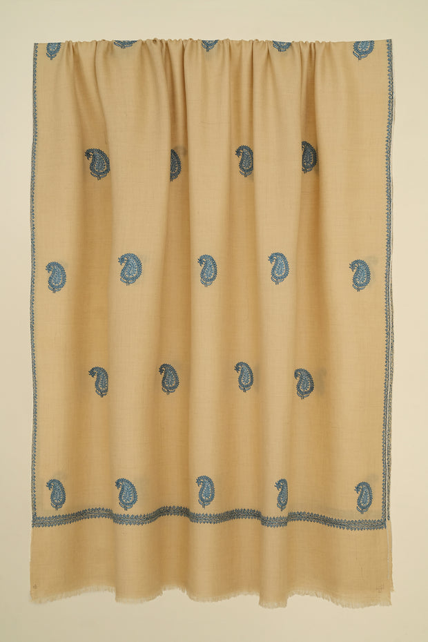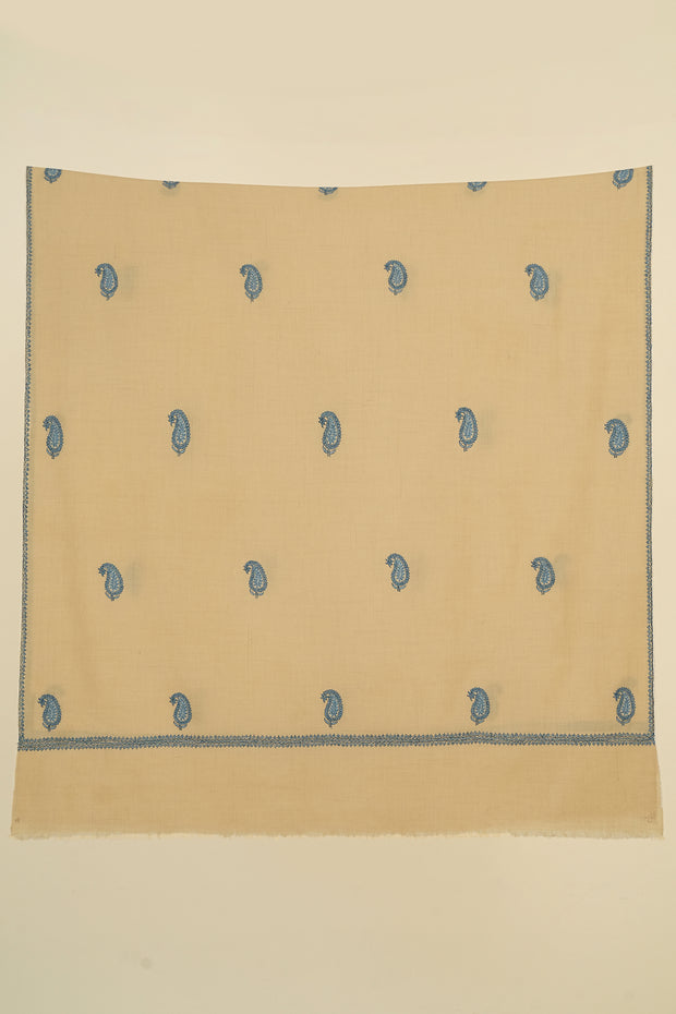 Arranged in an even, flowing repeat, the motifs create a sense of quiet rhythm across the surface. Rooted in one of the most recognisable elements of the Kashmiri design vocabulary, the composition combines tradition with a light, graceful presence suited to contemporary wear.