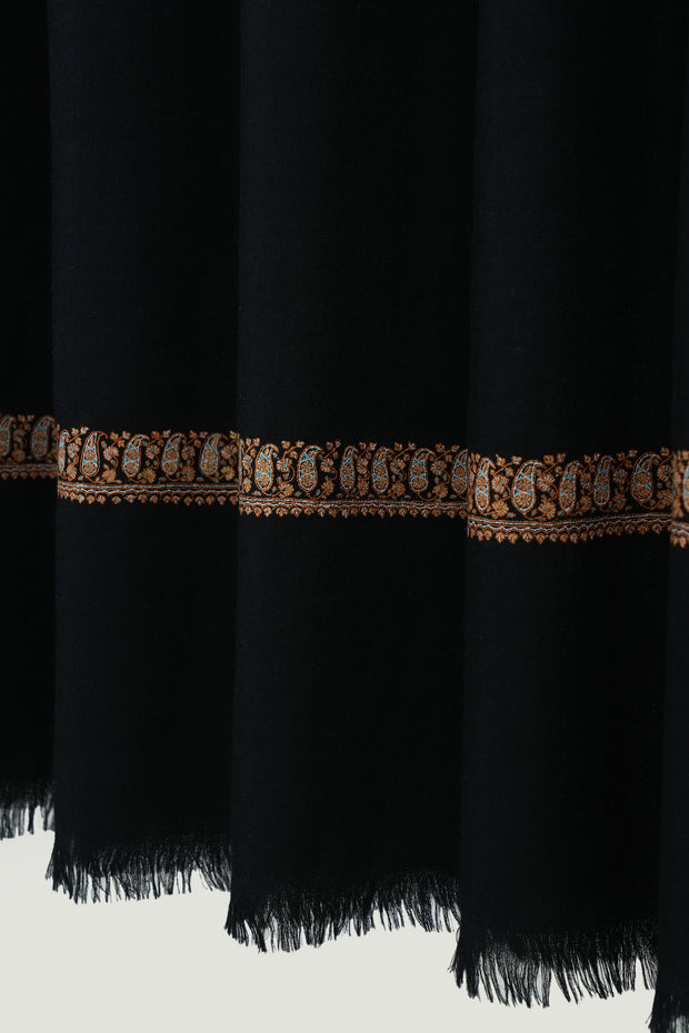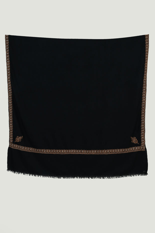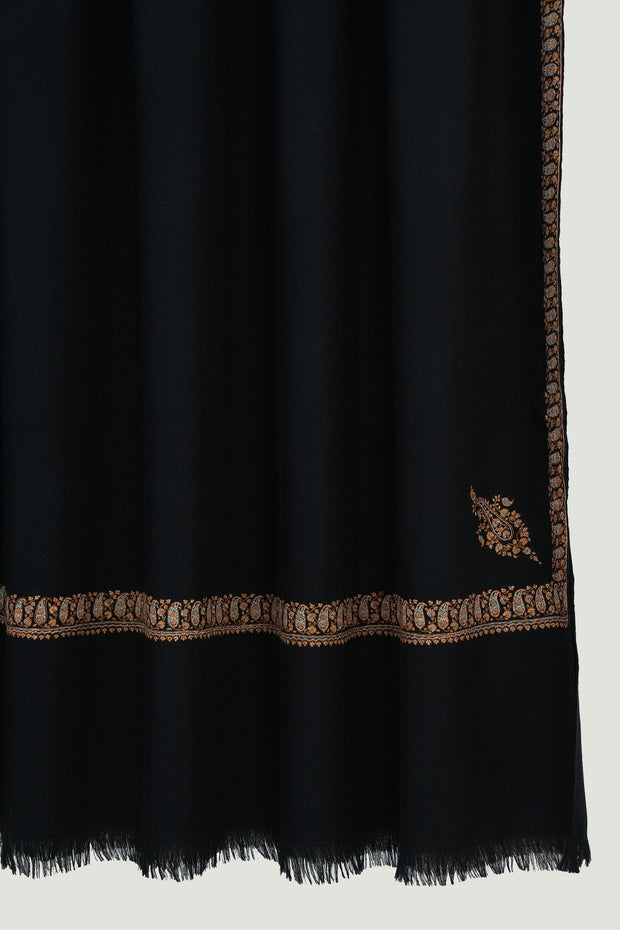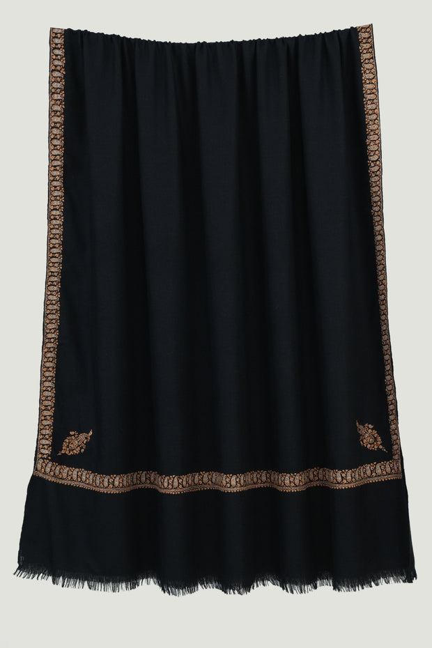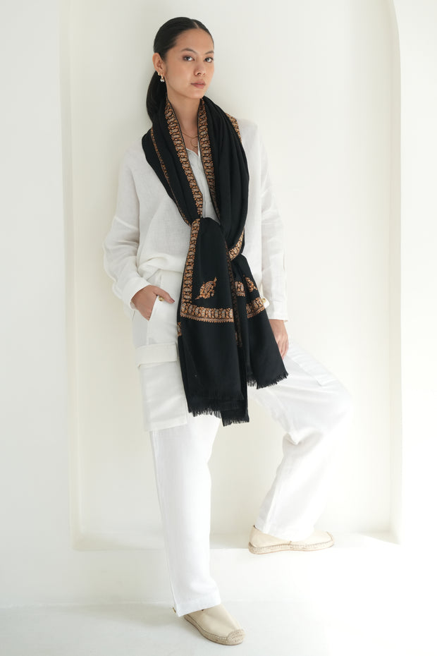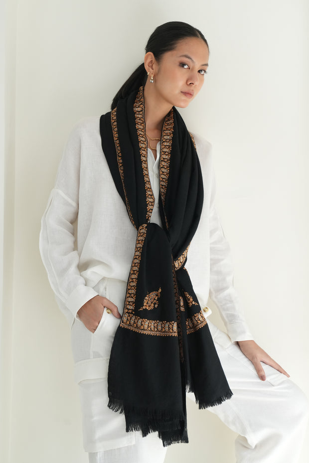 The delicate and minimalistic paisleys on the corners of this shawl, framed with a thin neemdor border, bring life to this large pashmina piece. The lightness of the design highlights the natural beauty of the handspun base, allowing the embroidery to breathe. Elegant and versatile, it drapes effortlessly across both formal and casual ensembles.