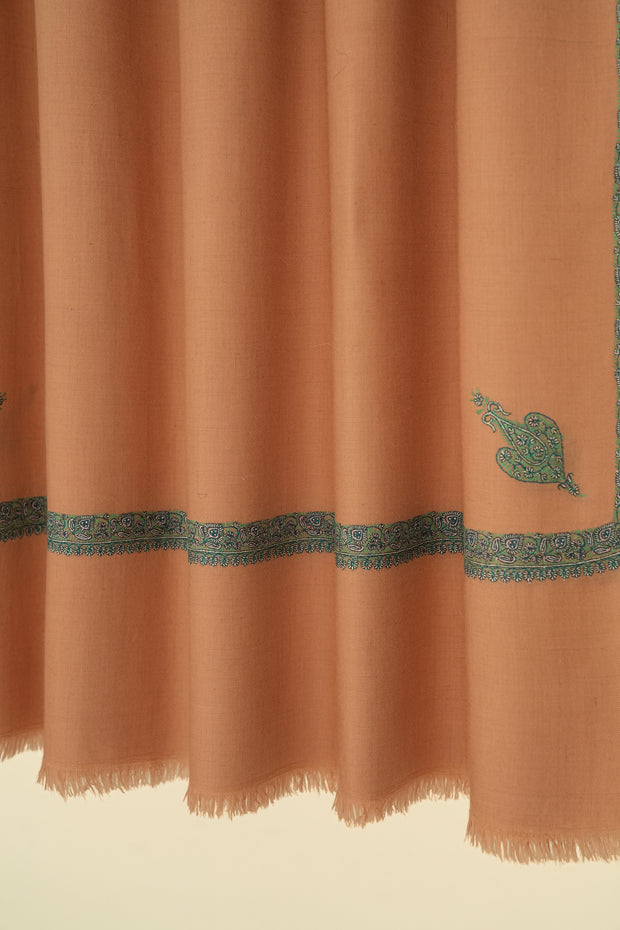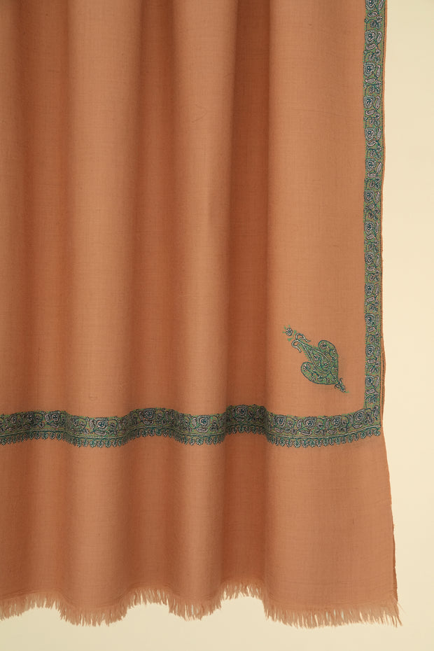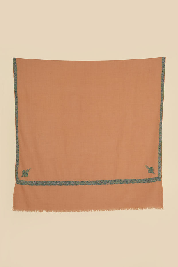 Small corner butis placed on all four sides anchor the composition with a quiet, balanced presence. A defined hashiya border frames the field, its fine detailing adding depth without overwhelming the surface. The intricacy of the work reflects careful craftsmanship and precision. Light in character yet refined, the shawl lends an effortless sense of polish to a wide range of ensembles.