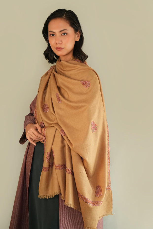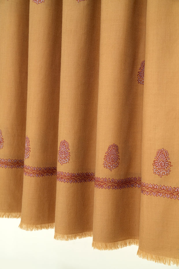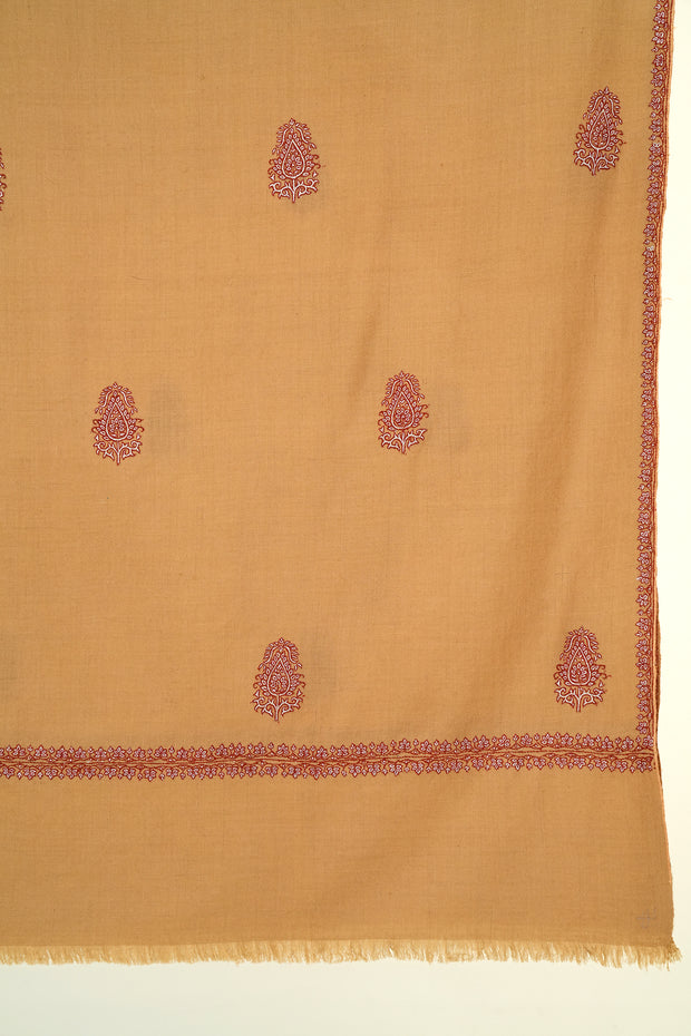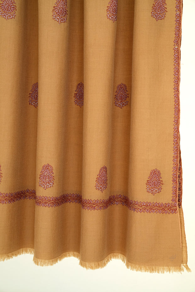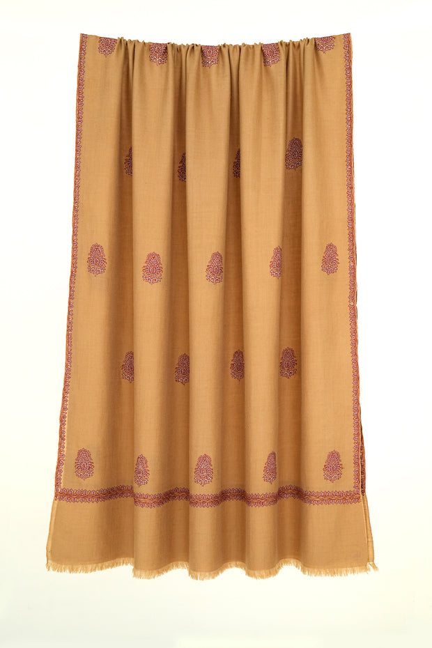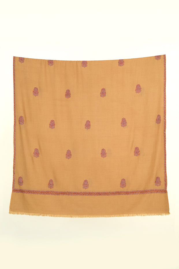 Vibrant straight paisleys adorn the soft canvas of pashmina, framed by thin, defined hashiya borders. The composition speaks elegance and grace, making it a refined addition to any collection.