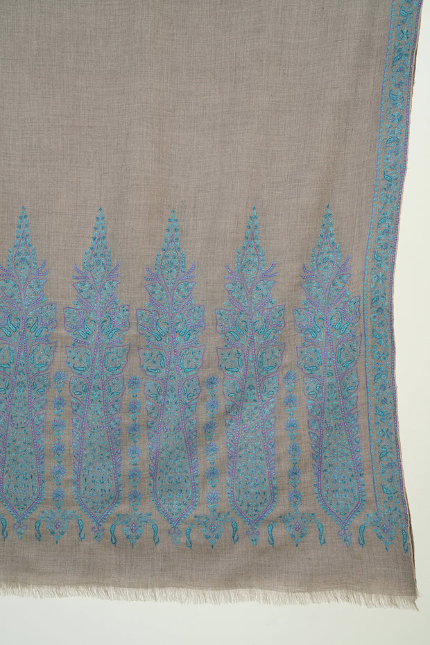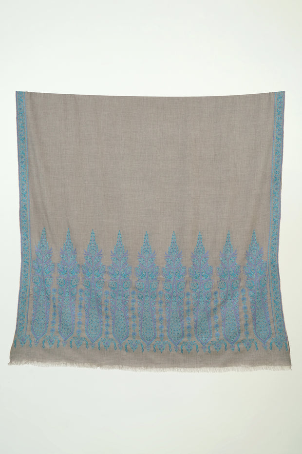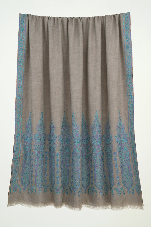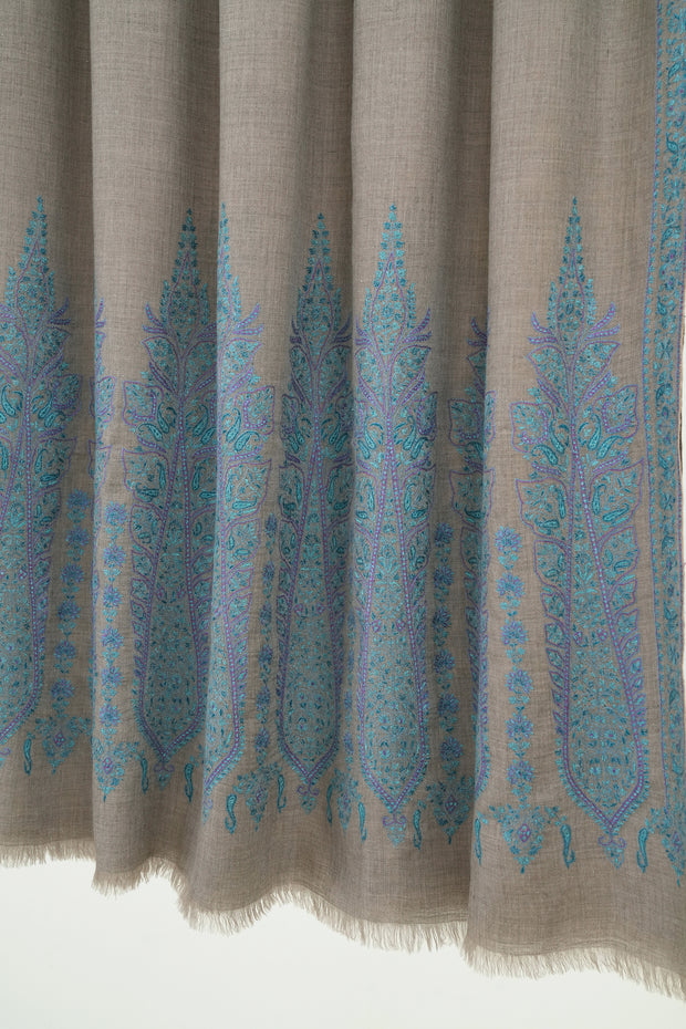 This classic natural hand-embroidered pashmina shawl creates a dramatic effect and is sure to make this a conversation piece. The embroidery on the shawl has wide borders of tall paisley-inspired motifs on the short ends or 'palla' as it is locally known in Kashmir and is finished with a beautifully paired border all around.