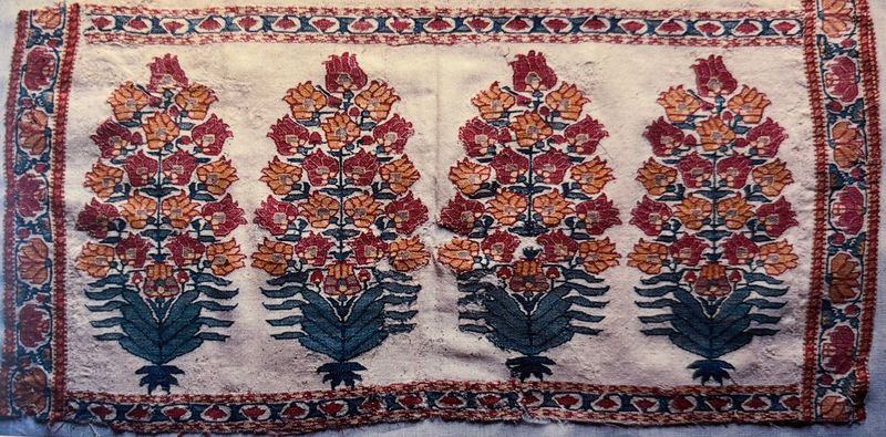 As has been shown above, similar designs are found in Mughal silk velvets, and they are also found on other forms of textiles. One example is the poppy motif, found on a group of well-known cotton textiles, including a large poppy floor spread, or ‘summer carpet’, block printed or stencilled with qalamkārī (lit. ‘pen work’) in mordant and resist, possibly made in Burhanpur, c. 1650 CE and now in the Victoria and Albert Museum, London. At almost four metres in length, this complete example and other related textiles have become important sources of inspiration for contemporary textile designers.