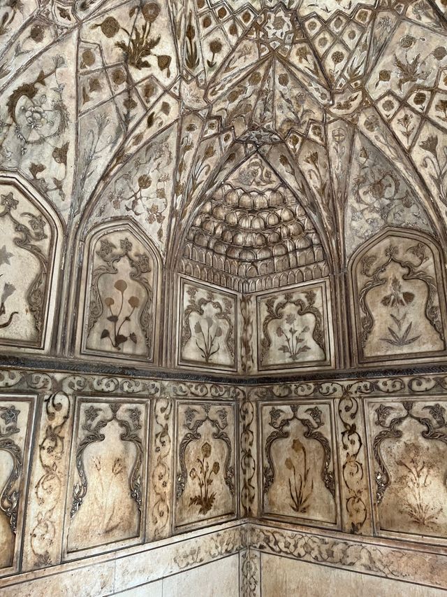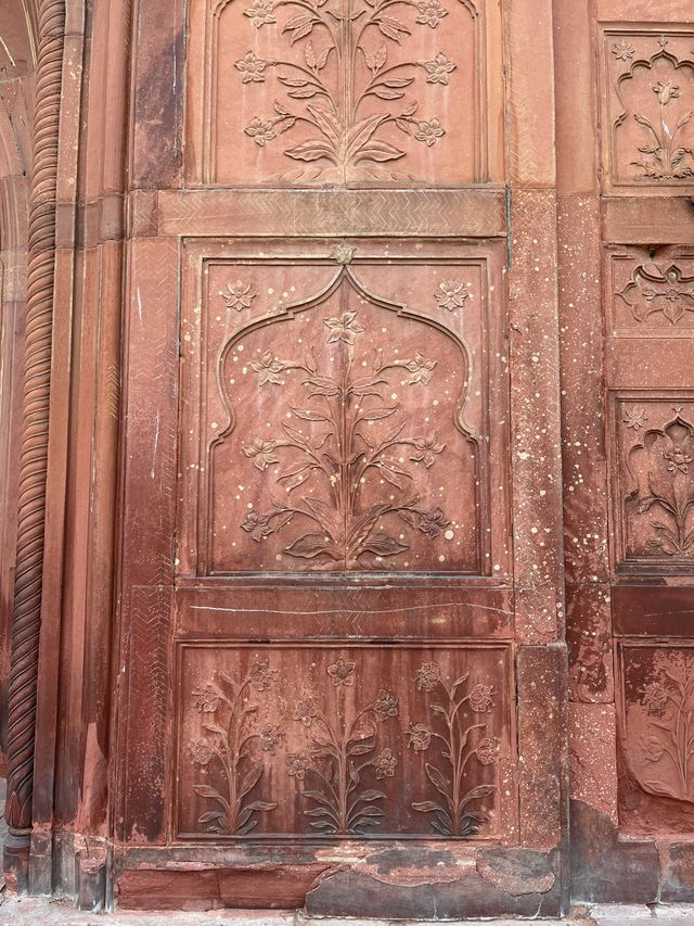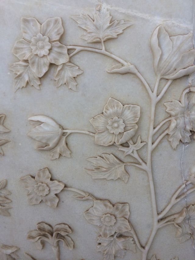 Beyond Agra, on the walls of still extant structures within the Lal Qila (Red Fort), in Shahjahanabad in Delhi, floral motifs of a similar kind can also be found, for example carved into the red sandstone walls of the naqqārkhāna (drum house). Such motifs were not limited to the architecture of Shah Jahan, and can also be seen on the carved marble wall decoration inside Amer Fort, in Rajasthan [4]. Their appearance in Agra, Delhi and Amer fort also shows that these motifs were not limited to a specific setting, found in both tombs and palaces.