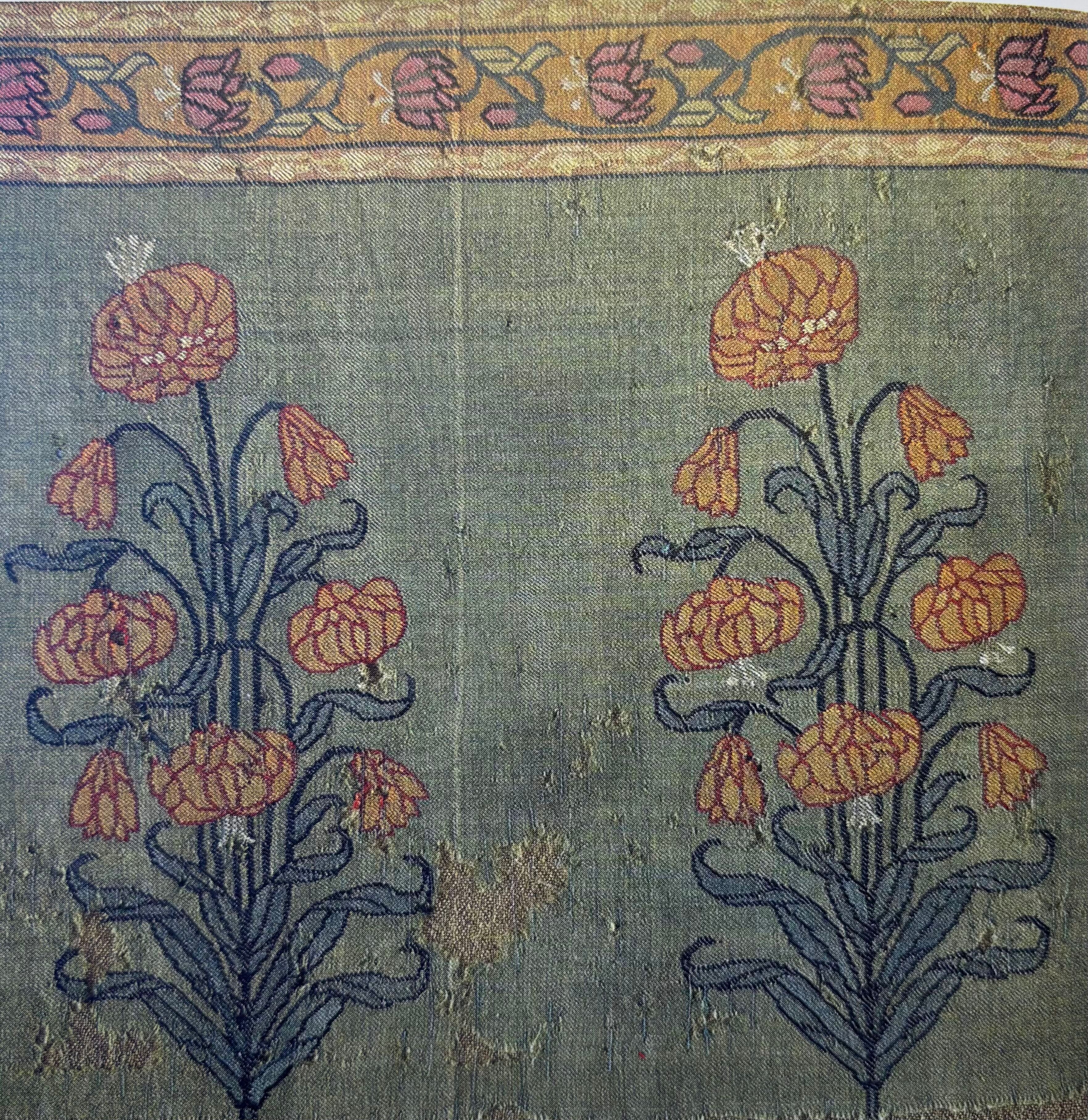 One detail of a fragment of a long shawl or patka, woven of pashmina fibre and now in the Musée Guimet in Paris dates to the turn of the eighteenth century [5]. Salmon pink buds at different stages of bloom cover each formalised flowering plant, and stand on a sage green background, bordered in yellow strips filled with pink blossoms.