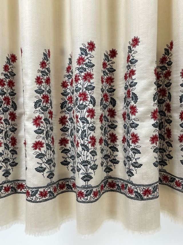 Kashmir Loom was inspired by the poppy motif from the V&A textile, which Co-Founder Asaf Ali first saw during the Fabric of India exhibition in 2015. One of their classical shawls shows similar blooming red poppies, their designs modified to introduce movement into the motif, and its appearance adapted for weaving in the kani technique. This double-interlocking twill tapestry weave involves the use of multiple wooden sticks wrapped with different colours of spun pashmina threads, slowly woven into one another, one by one, to create a pattern.