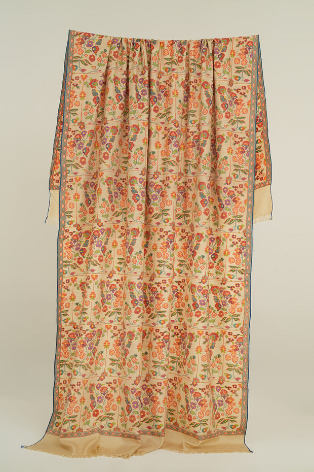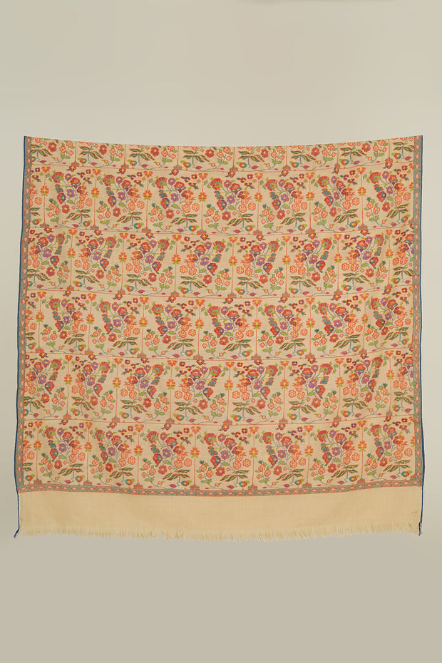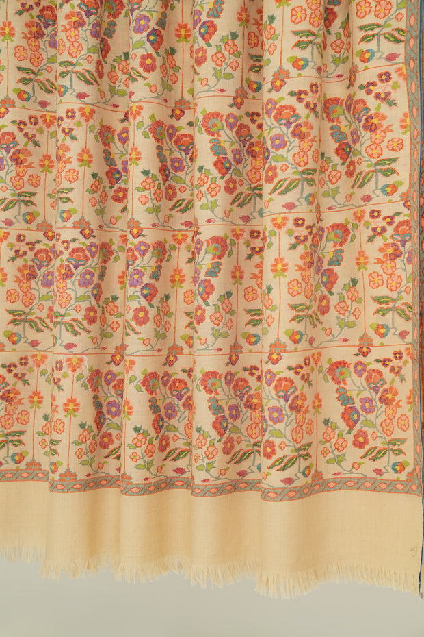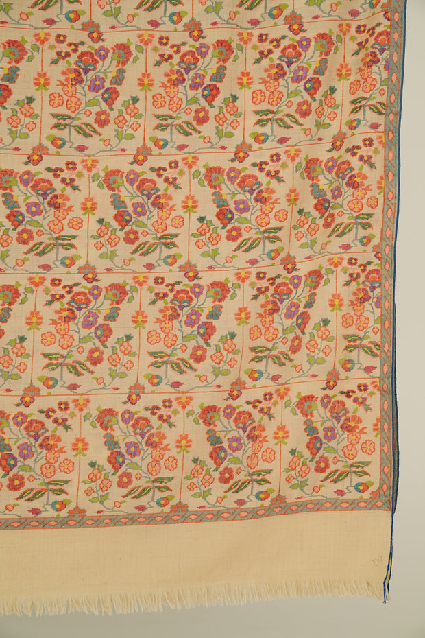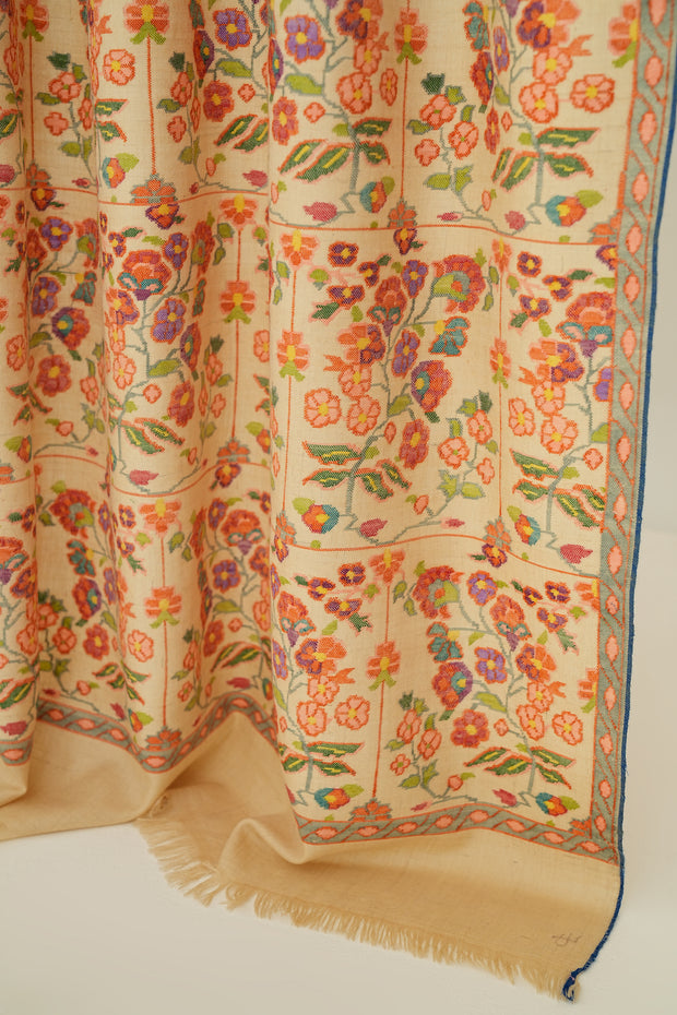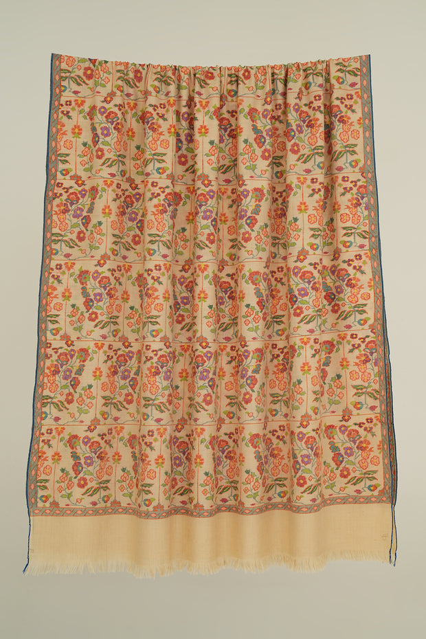 An exceptionally dense design woven with an array of harmonious colours makes this shawl a true collector’s piece, crafted only by a master weaver. A wearable work of art, its soft tones lend a gentle, vintage charm that speaks of timeless beauty and enduring craftsmanship.